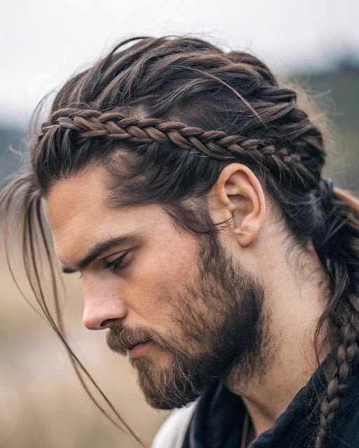 This iconic Viking style blends flowing, untamed hair with a bold, thick braided beard, capturing the essence of strength and rugged charm.